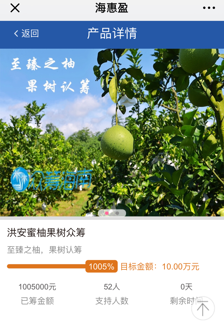 去年底,為了幫助企業解決短期資金流轉問題,海南股權交易中心聯合掛牌企業澄邁洪安農業開發有限公司發起了存續期為9個月的“洪安蜜柚果樹眾籌”項目,項目在股交中心綜合金融服務平臺“海惠盈”發布后短時間內達成了募集資金目標,最終募集金額達100.5萬元。