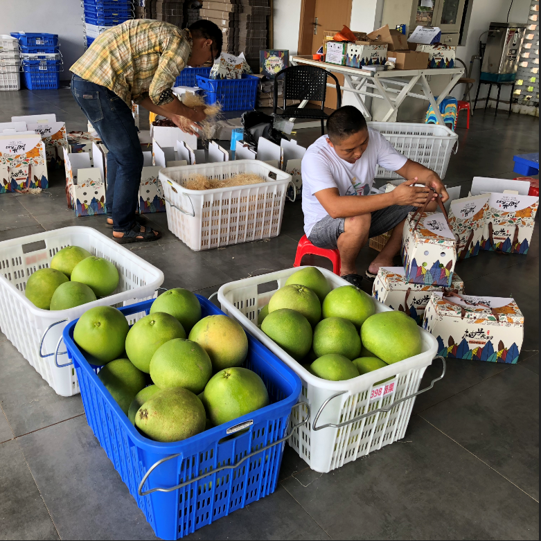 夏樹蒼翠,驕陽似火,烈日炎炎下洪安莊園的工人們依舊熱情飽滿的對采摘下來的蜜柚一一進行稱重、分類、打包和入庫。