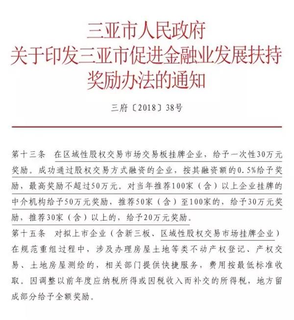 在國家采取精準有效措施大力支持中小微企業發展,解決中小微企業融資難、融資貴難題的大背景下。從2015年開始,海南省各級政府密集出臺鼓勵企業掛牌區域性股權交易市場(即四板市場)的政策。同時,在股份改制、掛牌、融資等方面,給予掛牌企業財政獎勵,以實際行動助力中小微企業對接資本市場,做大做強。