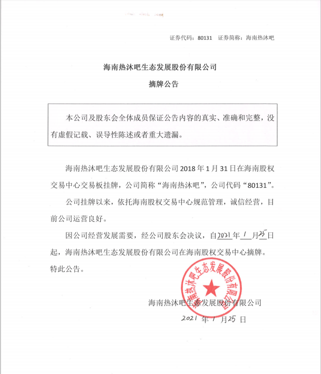 80131海南熱沐吧 海南熱沐吧生態發展股份有限公司摘牌公告